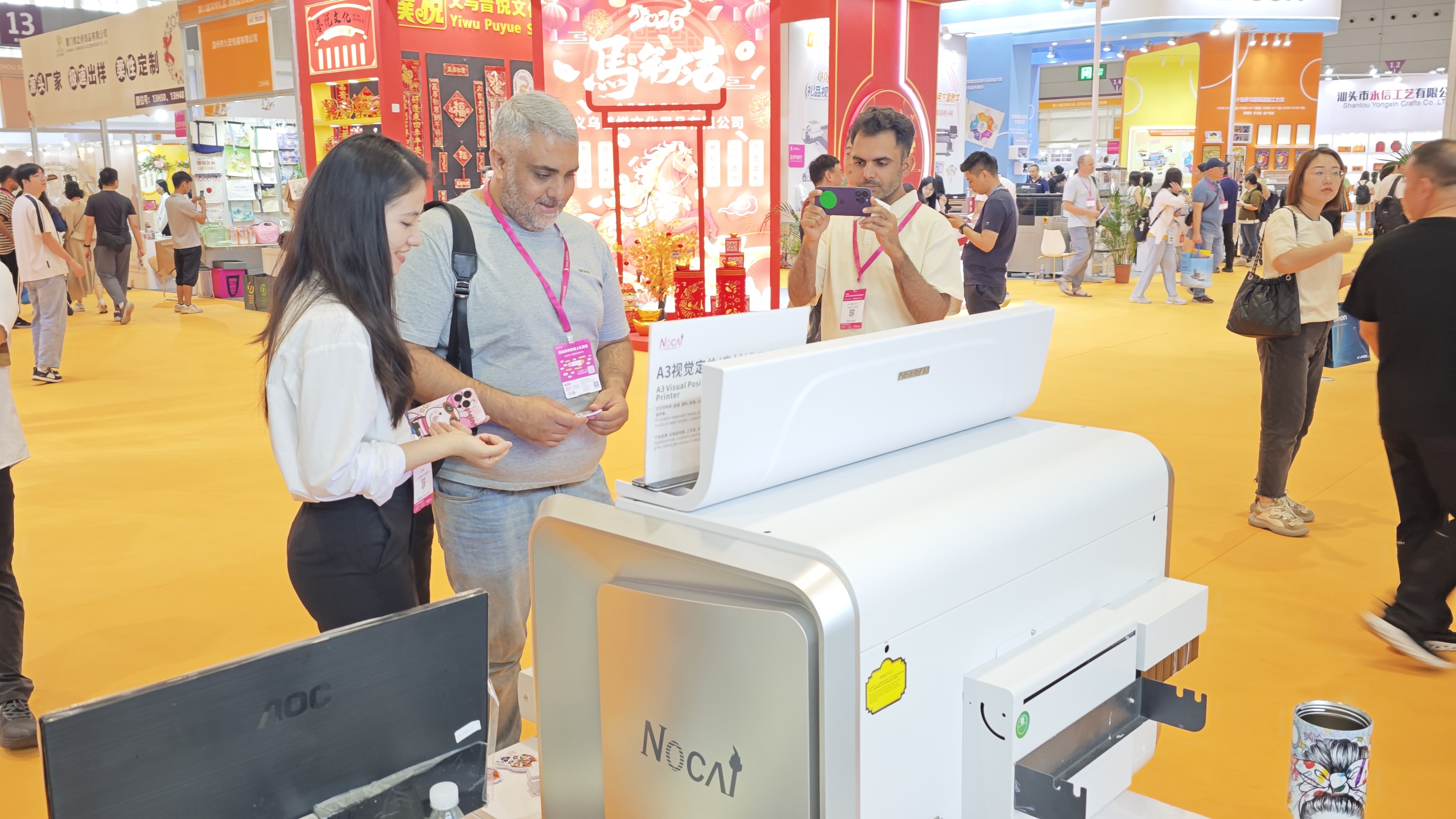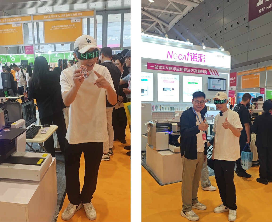 展会特设的隐藏款区,重点展示诺彩热销款 9060 视觉定位打印机。该设备凭借精准定位优势迅速吸客,不少客户专程咨询适用场景与合作细节,五金徽章定制客户更当场表达意向,热度堪比主力产品区。