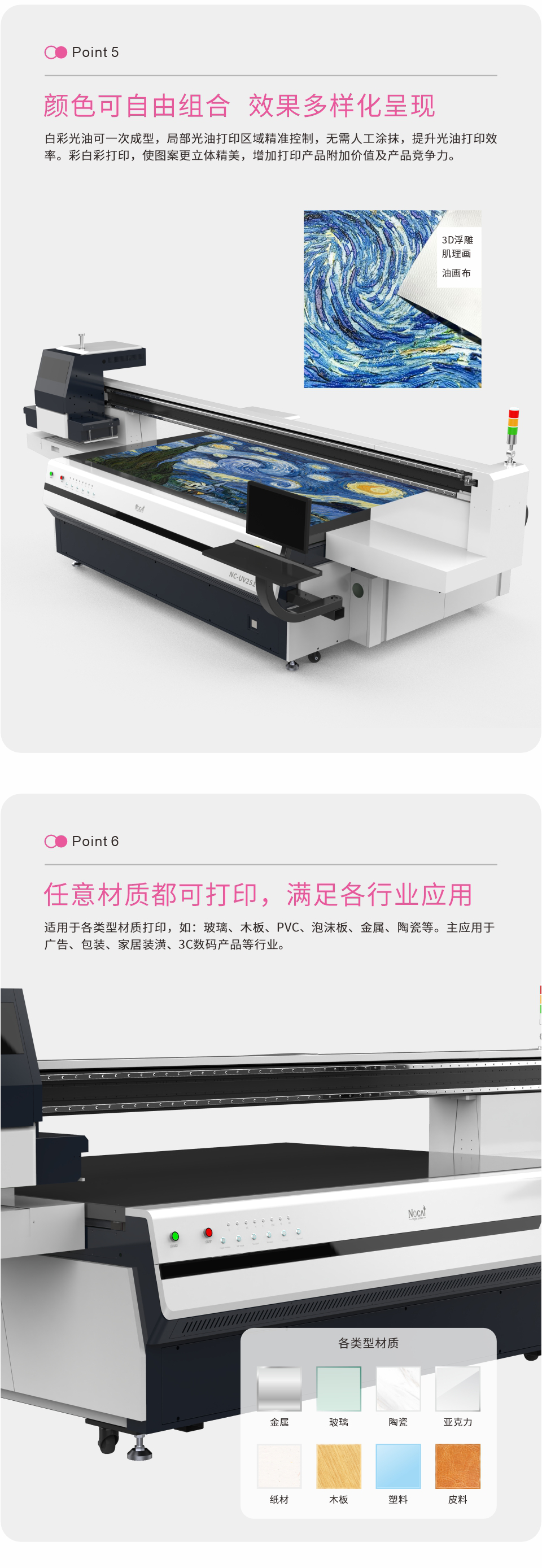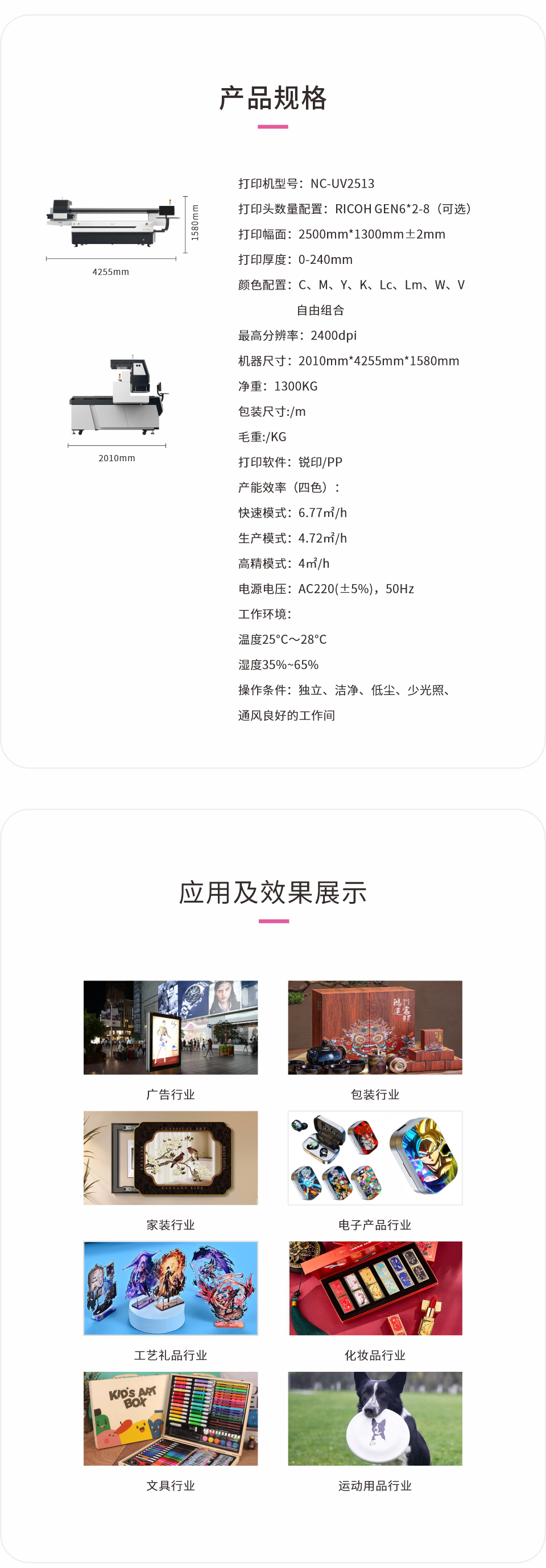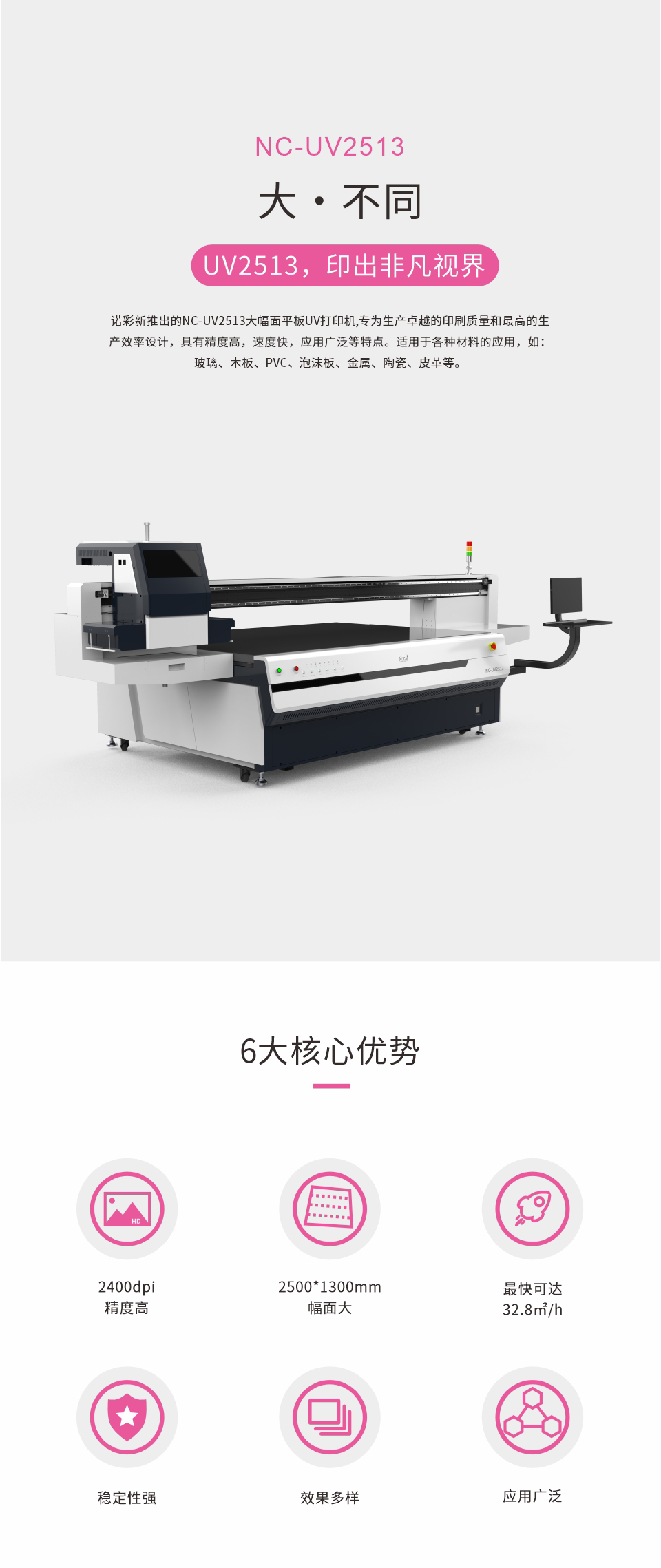 适用于各类型材质打印,如:玻璃、木板、PVC、泡沫板、金属、陶瓷等。主应用于广告、包装、家居装潢、3C数码产品等行业。