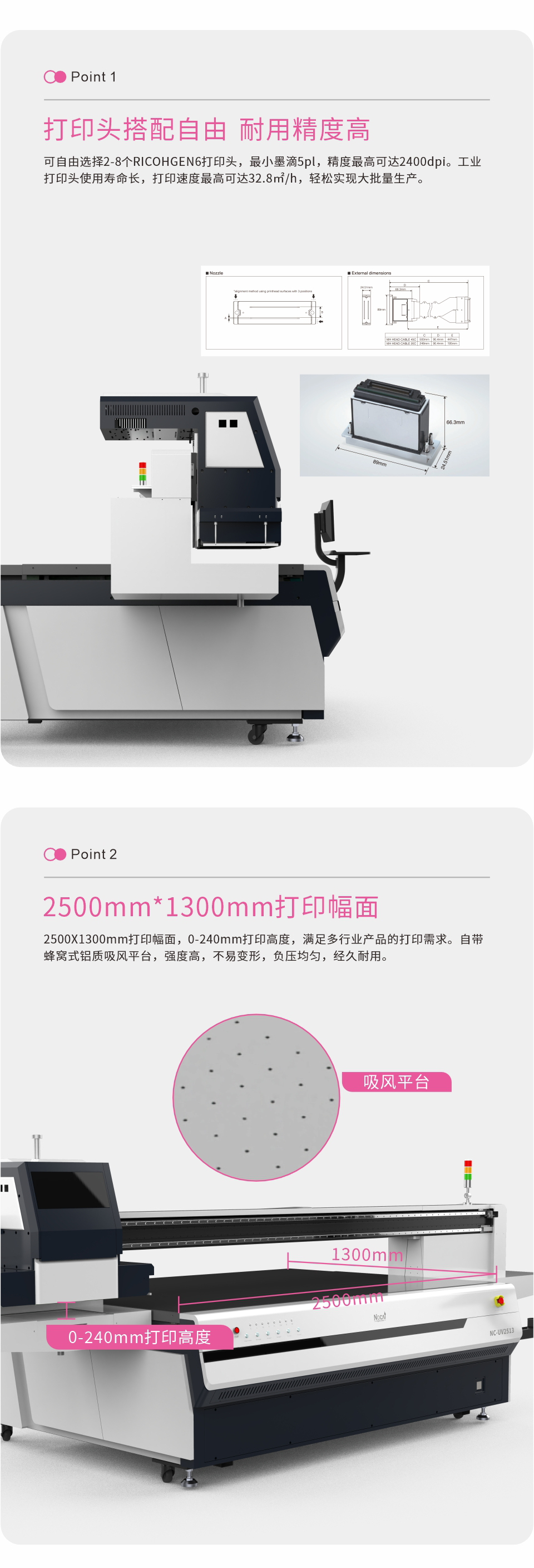 2500X1300mm打印幅面,0-240mm打印高度,满足多行业产品的打印需求。