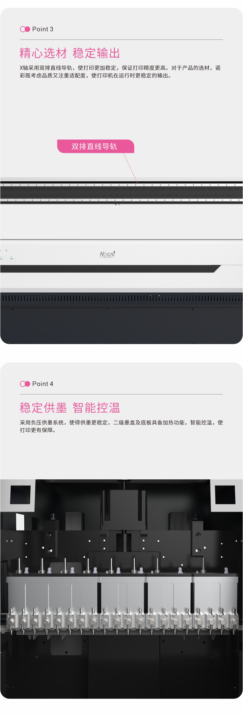 采用负压供墨系统,使得供墨更稳定,二级墨盒及底板具备加热功能,智能控温,使打印更有保障。