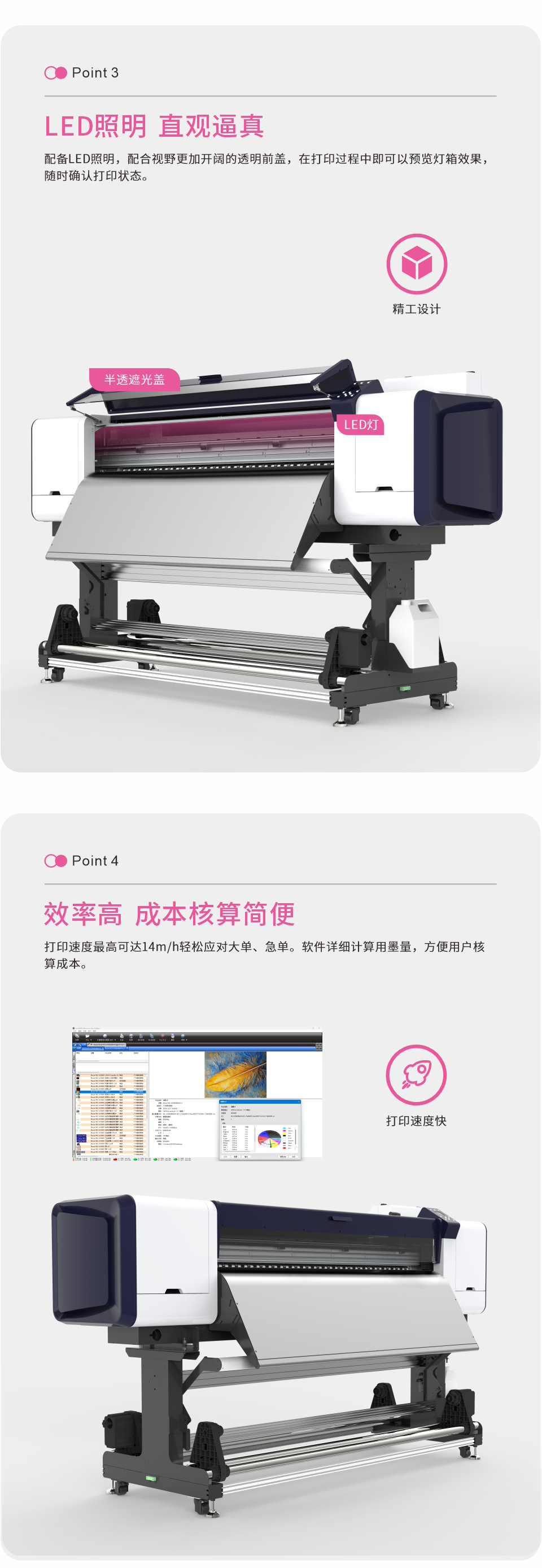 打印速度快,轻松应对大单、急单。软件详细计算用墨量,方便用户核算成本。
