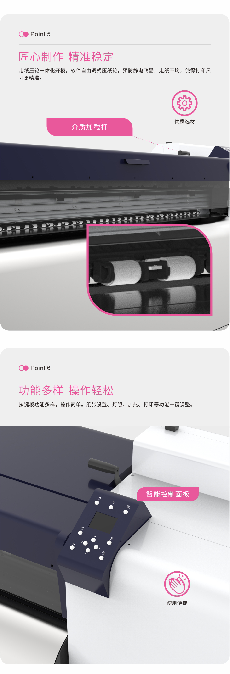 走纸压轮一体化开模,软件自由调式压纸轮,预防静电飞墨或走纸不均的问题,使得打印尺寸更精准。