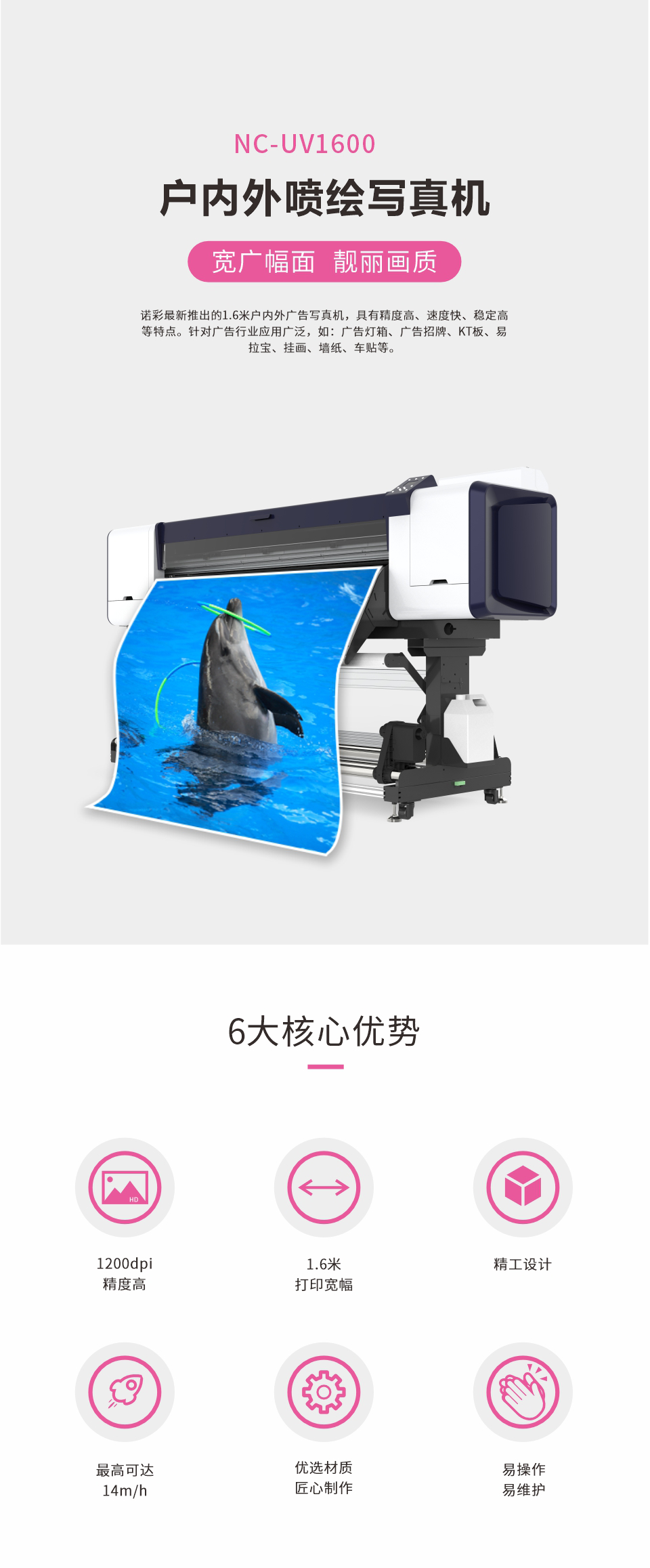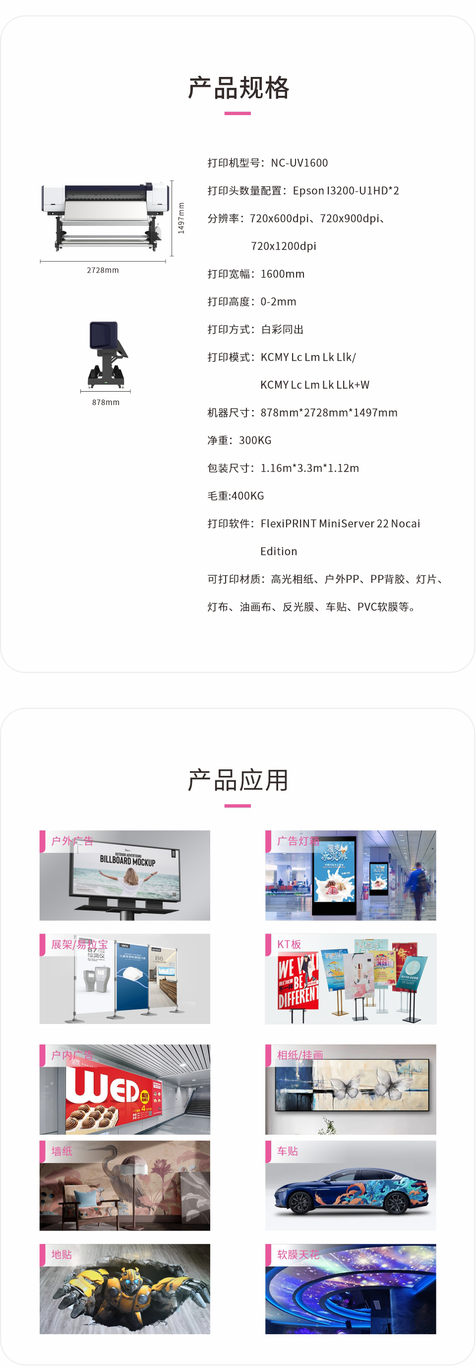 打印幅宽1.6米,适合大部分产品使用,如、广告灯箱KT板、易拉宝、相纸、车贴、地贴等。