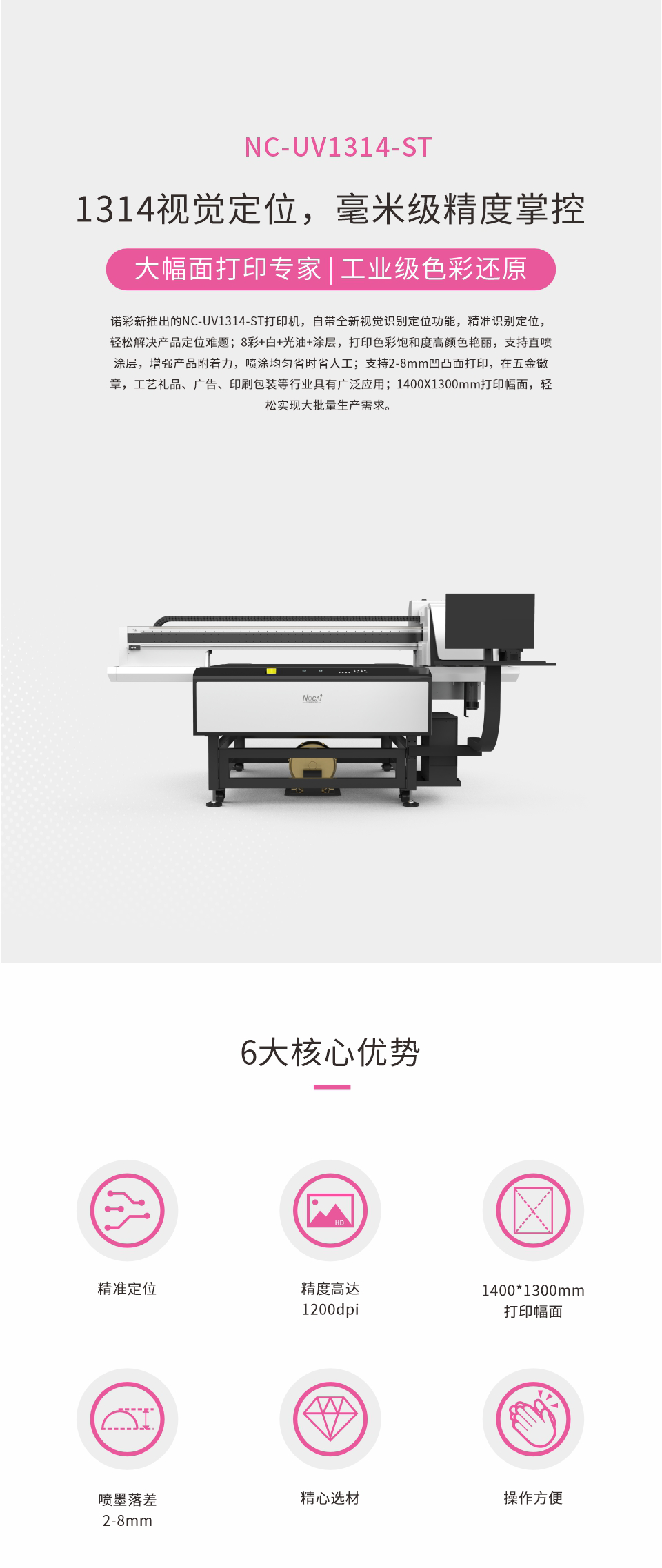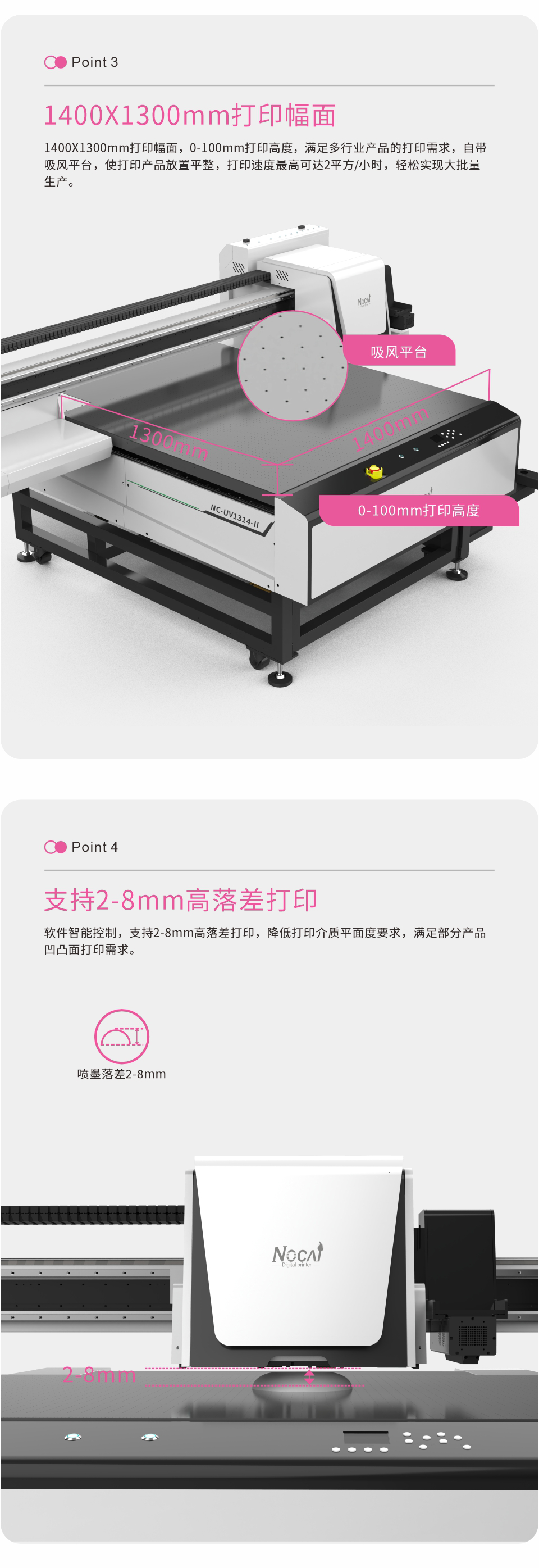 1400X1300mm打印幅面,0-100mm打印高度,满足多行业产品的打印需求,自带吸风平台,使打印产品放置平整,打印速度最高可达2平方/小时,轻松实现大批量生产。