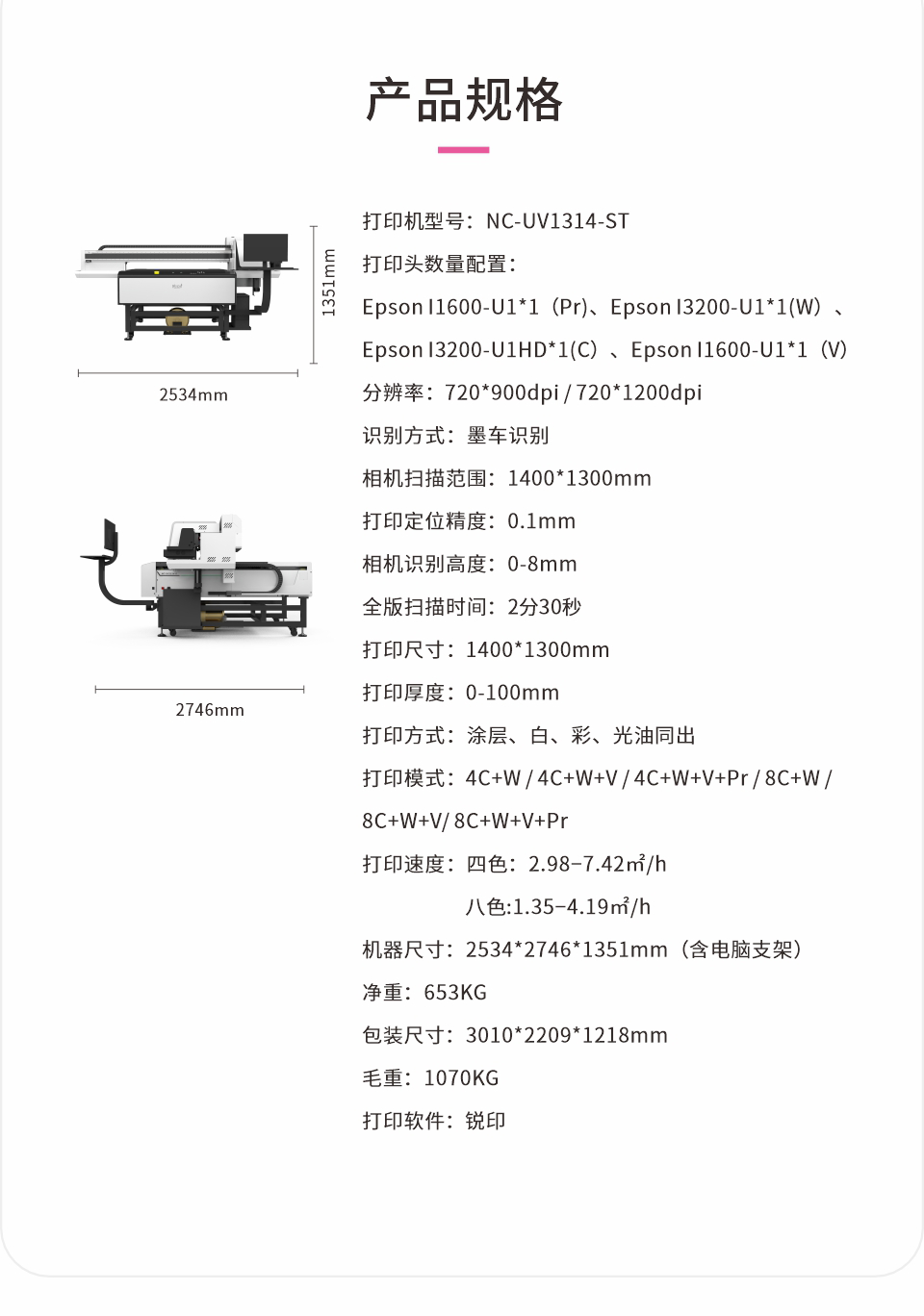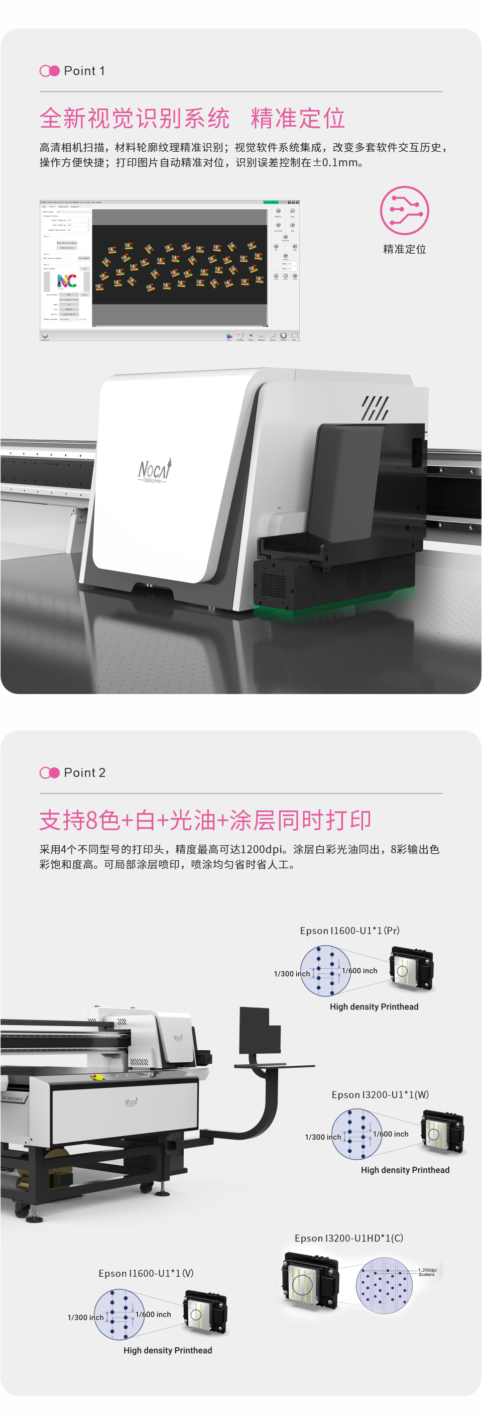 采用4个不同型号的打印头,精度最高可达1200dpi。涂层白彩光油同出,8彩输出色彩饱和度高。可局部涂层喷印,喷涂均匀省时省人工。