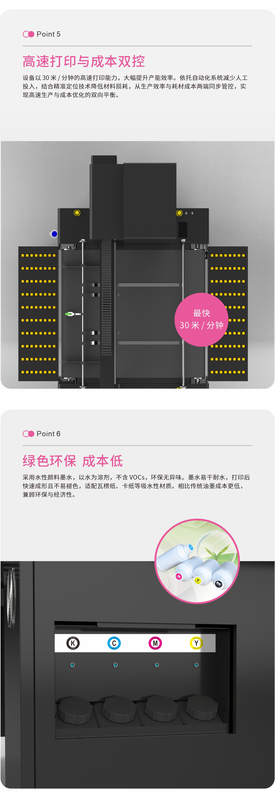 设备以 30 米 / 分钟的高速打印能力,大幅提升产能效率。依托自动化系统减少人工投入,结合精准定位技术降低材料损耗,从生产效率与耗材成本两端同步管控,实现高速生产与成本优化的双向平衡。